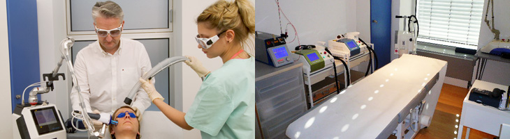 Die derzeit innovativste Technik ist die Behandlung von (Akne-)Narben oder Altersfältchen durch unsere jüngste Neuanschaffung, den fraktionierten CO2-Laser. Durch winzig kleine Einschüsse in die Haut kommt es zur Straffung und Neubildung von körpereigenem kollagenem Bindegewebe. Wie gewohnt können wir aber auch alle anderen, kosmetisch störenden Hautveränderungen wie Alterswarzen, Leberflecken, Xanthelasmen (Fettablagerung am Augenlid), vergrößerte (hyperplastische) Talgdrüsen inkl Rosacea-Rhinophym, Syringome (Schweißdrüsenwucherungen), epidermale Naevi, überschießende Narben durch einen ablativen, d.h. schonend gewebeabtragenden Laser (CO2-Laser) behandeln.